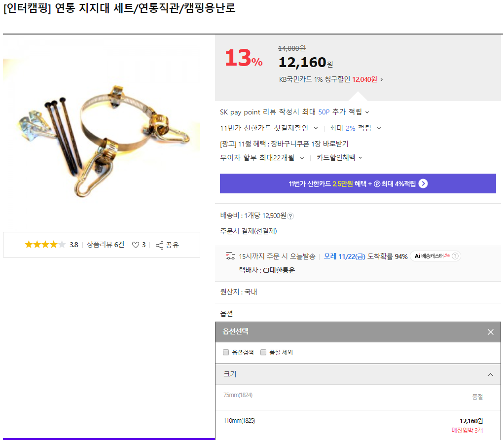 [인터캠핑] 연통 지지대 세트/연통직관/캠핑용난로 - 11번가